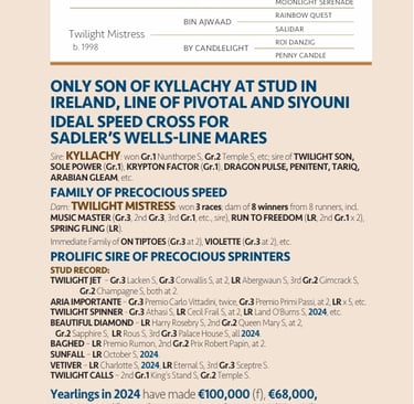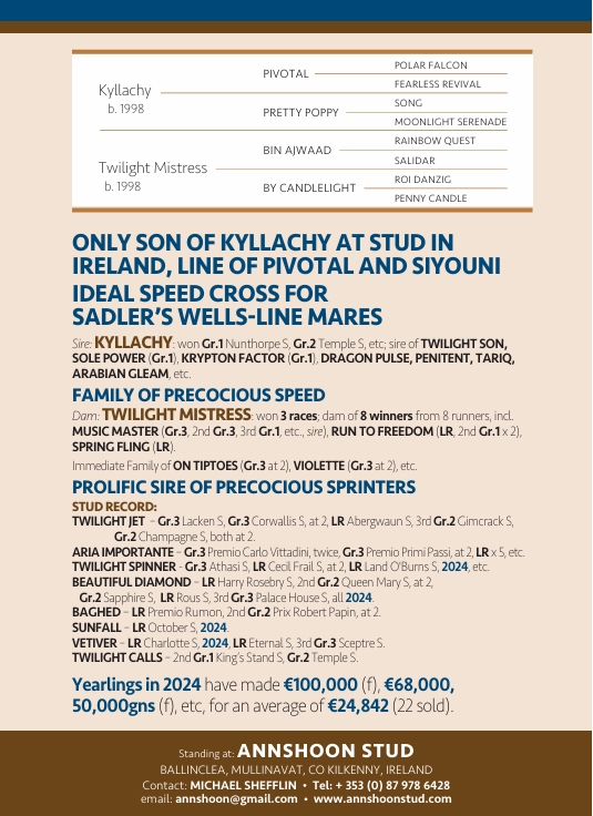 On acquiring the horse, Michael Shefflin of Annshoon Stud said: "He came up on the radar because the farm was closing down. Gleneagles is in a good place, having sired the Japan Cup winner, and he produces distance-type horses, while there aren't really any sons of Gleneagles at stud for dual-purpose or jumping.